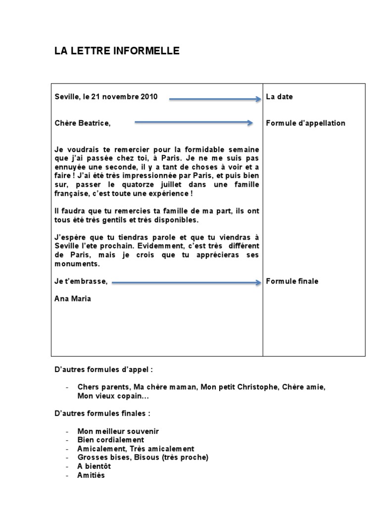 Ta lettre doit donc contenir les parties suivantes. Comment ecrire une lettre informelle par exemple a un copain ou un correspondant. Il est important de savoir comment commencer et terminer une lettre dans une langue etrangere car cela indique que vous etes familiarise avec la langue et avec la culture.