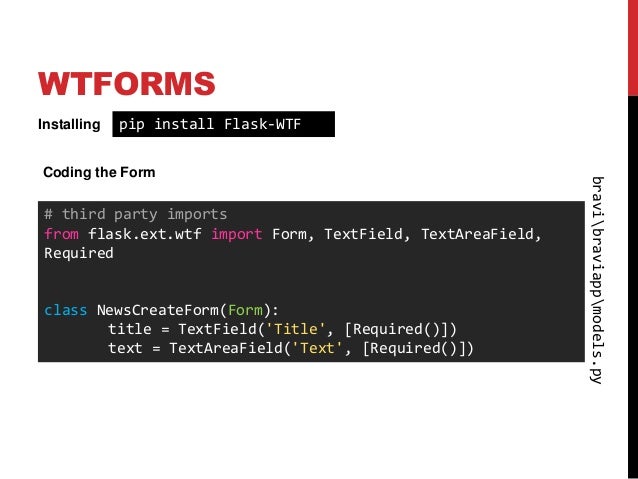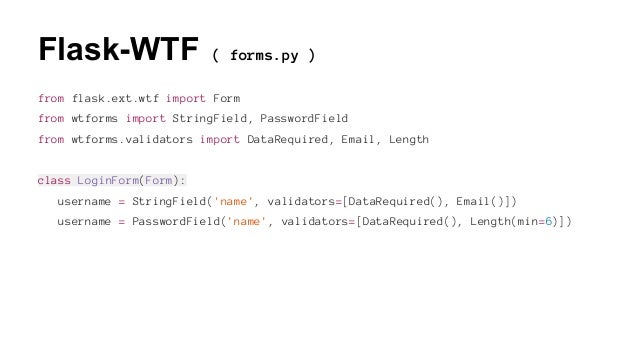 Filename size flaskwtf 0143 py2py3 none anywhl 134 kb file type wheel python version py2py3 upload date feb 6 2020 hashes view. Note that you dont have to pass requestform to flask wtf. Users guide this part of the documentation which is mostly prose begins with some background information about flask wtf then focuses on step by step instructions for getting the most out of flask wtf.